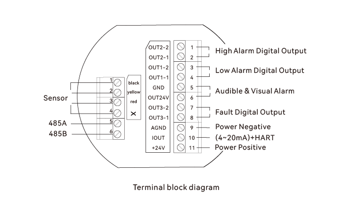 | Output Signal | 4~20mA (three-wire) 4~20mA + HART (optional) RS485 Modbus (four-wire) Three relay switch outputs (2A 30V DC) 24V DC output (for driving audible and visual alarm) 4G/5G/NB-IoT/LoRa wireless communication (optional) |